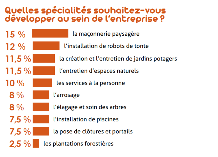 Menée du 8 au 18 octobre dernier, l’enquête Profession paysagiste menée auprès des entreprises du paysage (627 résultats exploitables) a demandé aux paysagistes quels étaient leurs souhaits de développement pour les années à venir : les résultats sont plus qu’intéressants ! Ainsi, passionnés et appréciés, les entrepreneurs du paysage nous confient vouloir s’orienter principalement vers la clientèle privée et développer de nouvelles compétences.