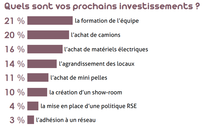 Modernisation, ergonomie, moindre pollution sonore mais aussi source d’énergie décarbonée poussent l’investissement dans l’achat de matériels électriques pour 16 % des répondants. Ensuite, l’agrandissement des locaux (14 %) et la création d’un show-room (10 %) font aussi partie des prochains investissements des entrepreneurs du paysage. Tandis que 11 % veulent investir dans l’achat de mini pelles, 4 % souhaitent mettre en place une politique RSE et près de 3 % veulent adhérer à un réseau.
