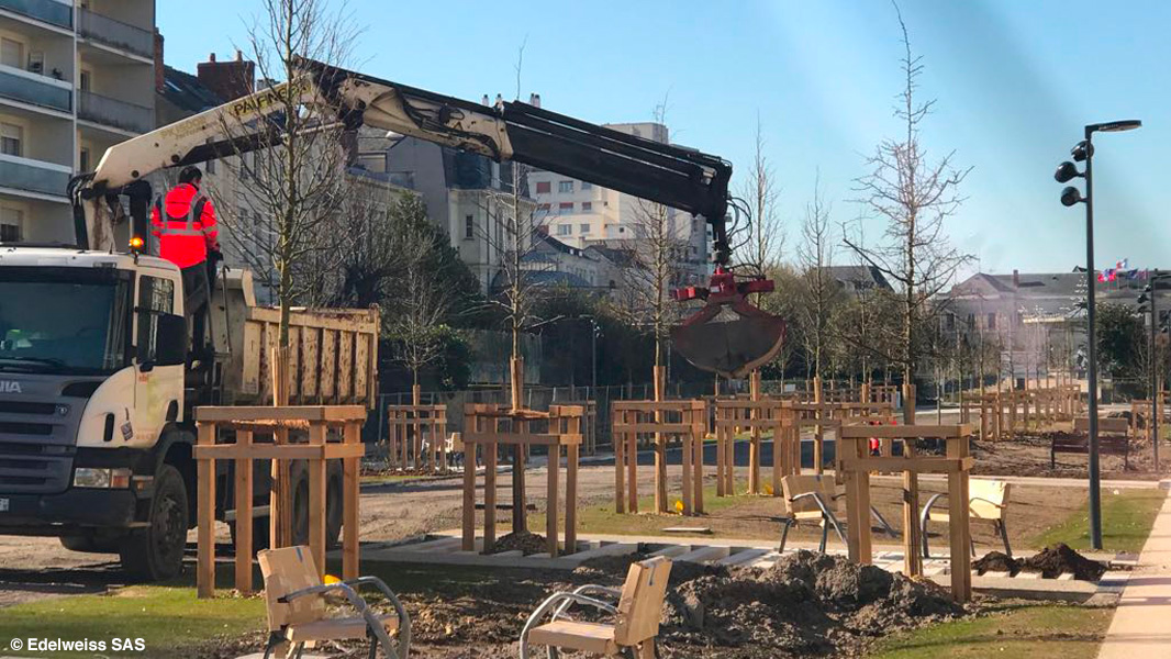 Autre innovation : un procédé de fixation de motte sans ancrage, tout-en-un, lorsque la zone de plantation s’avère peu profonde et les réseaux enterrés nombreux, afin de remplacer l ’ancrage sur treillis soudés et traverses en béton et pour réaliser une plantation sur dalle. Des cellules en plastique recyclé et interconnectables permettent de créer une plateforme de plantation parfaite pour les plantations en toiture et sur terrasse qui, en plus de jouer leur rôle de maintien de l’arbre, permettent de retenir l’eau et de maintenir le sol humide plus longtemps.