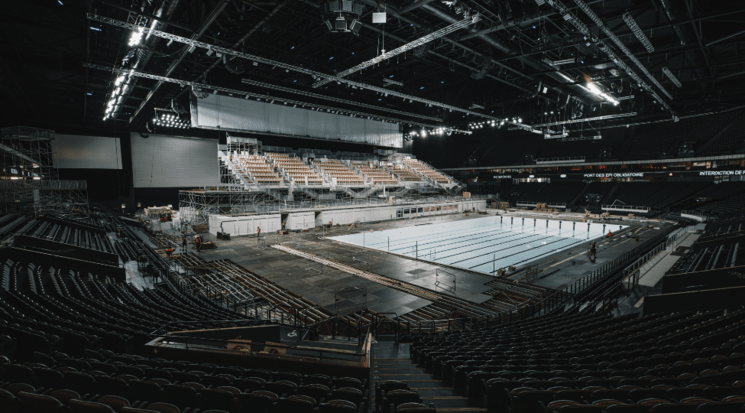 Sous la direction des équipes du comité d’organisation des JOP 2024, les ouvriers de Myrtha Pools ont pris possession du site le mercredi 15 mai et ont eu 36 jours pour installer les deux bassins olympiques (2,20 m de profondeur) au sein de la plus grande salle indoor d’Europe (94 000 m2). L’un des bassins abritera les échauffements des nageurs, tandis que l’autre bassin accueillera les épreuves autour d’une jauge de 17 500 places, complétée par une tribune presse exceptionnellement agencée pour l’occasion.