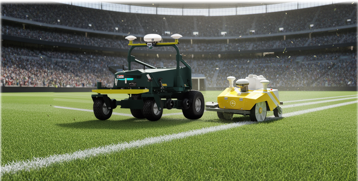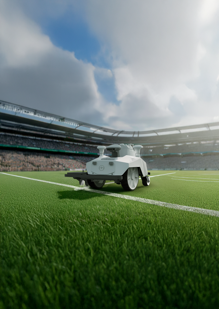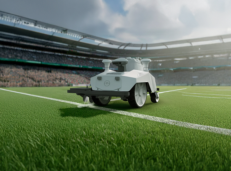 Le Vista, robot traceur de lignes guidé par RTK, permet un marquage rapide et reproductible sur tous types de terrains grâce à ses cartes multisports (football, rugby, athlétisme, etc.). Il garantit un traçage constant, précis et économe en peinture.