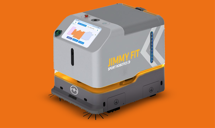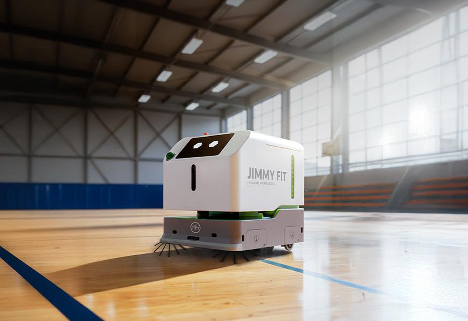 -JIMMY FIT, l’autolaveuse robotisée avec désinfection UV intégrée, idéale pour les gymnases et sols sportifs.