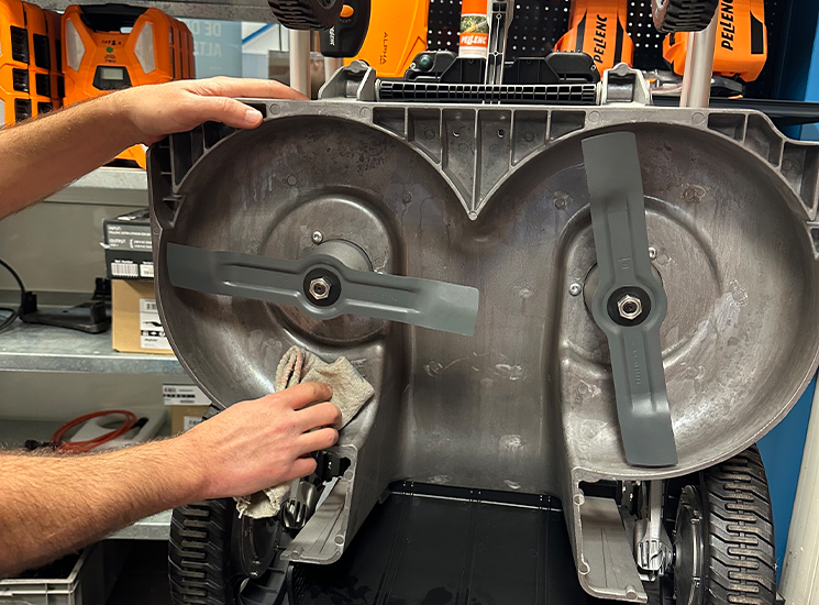 le plateau de coupe doit être soigneusement nettoyé après chaque utilisation. Cela contribue à prolonger la durée de vie du carter et à maintenir une qualité de tonte constante et à préserver l’aspect général de la machine. «