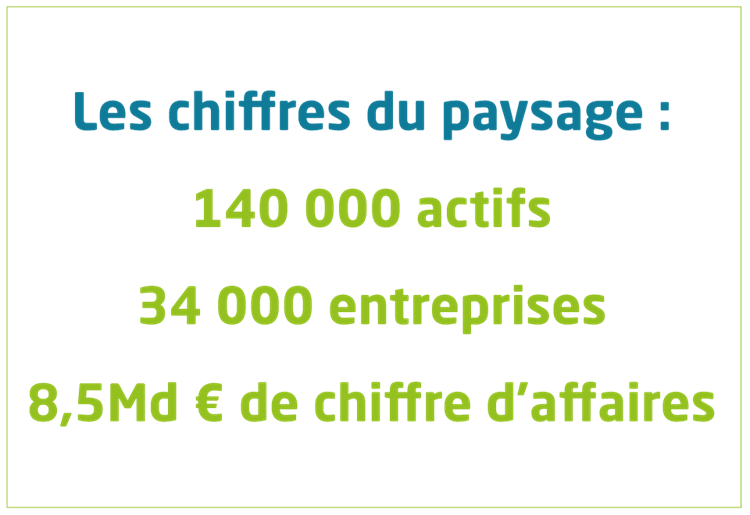 Les emplois salariés du paysage représentent aujourd’hui 40 % de l’emploi salarié agricole. Côté activité, le chiffre d’affaires du secteur se répartit de manière équilibrée : 50 % proviennent des commandes des particuliers, tandis quela commande publique etles grands donneurs d’ordres (marchés immobiliers et industriels) représentent chacun 25 %.