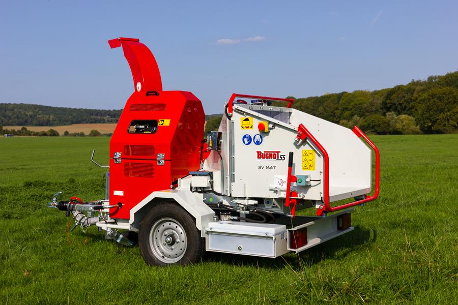 Broyeur de branches et végétaux équipé d'un rotor muni de 24 fléaux mobiles ou de 6 outils coupants (option), largeur d'entrée du canal de coupe 234 mm, trémie avec entrée déportée pour optimliser le chargement des déchets de taille. Alimentation par un tapis inférieur Extra large et un tapis supérieur ( ou rouleau supérieur )