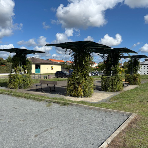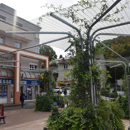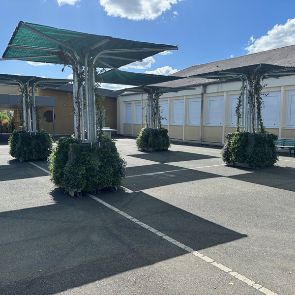 Une fois végétalisée avec des plantes grimpantes, cette structure en “arbre parasol” propose une couverture ombragée de 9 m² pour 18 m² au total de végétation . Ainsi, le piéton s’y reposera à la fraîcheur de l’ombre (près de 10° d’écart/plein soleil). CityMur Oasis est principalement prévue pour équiper les places minérales désertées durant l’été et les cours de nos écoliers démunis d’arbre. De structure auto portée et facilement déplaçable, les places pourront ainsi se transformer et accueillir des festivités, marchés et autres évènements. Associés à nos toiles d’ombrage, l’ombre sera présente dès le premier été et multipliera la surface d’ombrage entre plusieurs structures Oasis.