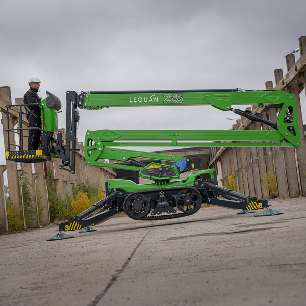 Hauteur travail : 22,50 m Déport max 11,2m - Mise en place automatique des stabilisateurs avec mise à niveau, - Moteur électrique en plus du thermique, - Retour automatique à la position de travail inital, - A roue ou à chenilles selon nature des terrains. Transport sur remoque 3,5tonnes