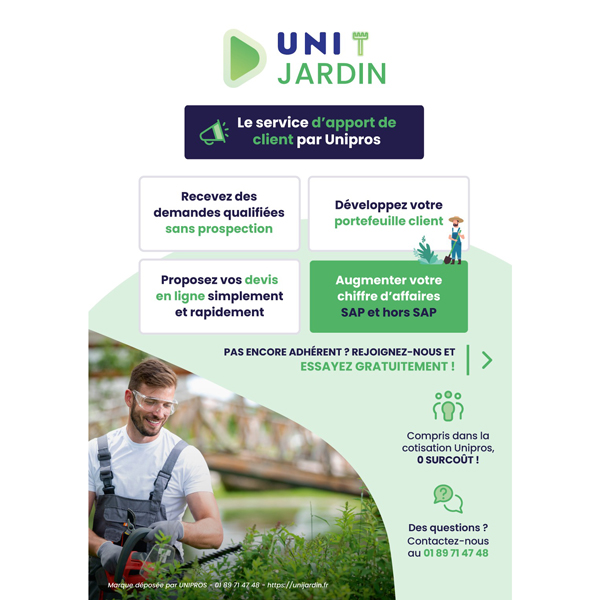 UNIJARDIN est une plateforme en ligne dédiée à la mise en relation entre des particuliers recherchant des prestations de jardinage ou de paysagisme et des professionnels qualifiés. Développé par Unipros, ce service permet à nos adhérents de recevoir des demandes ciblées de clients souhaitant entretenir ou aménager leur jardin, aussi bien dans le cadre des services à la personne (SAP) que pour des prestations hors SAP.