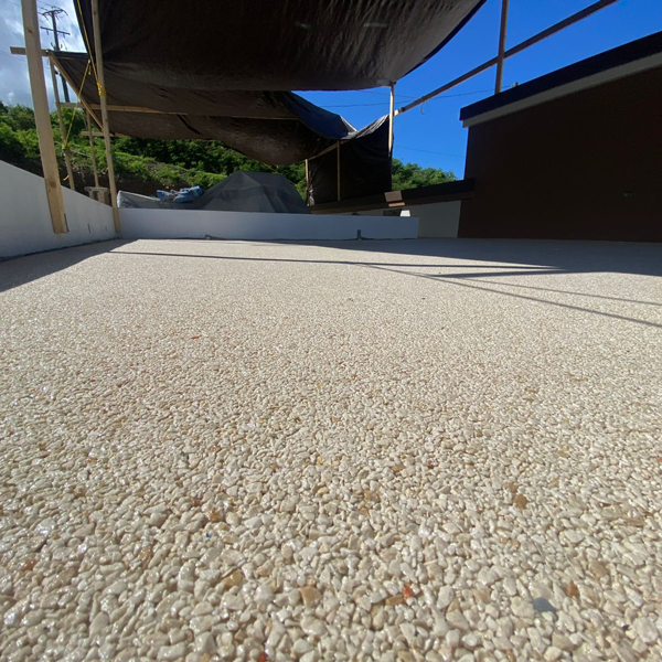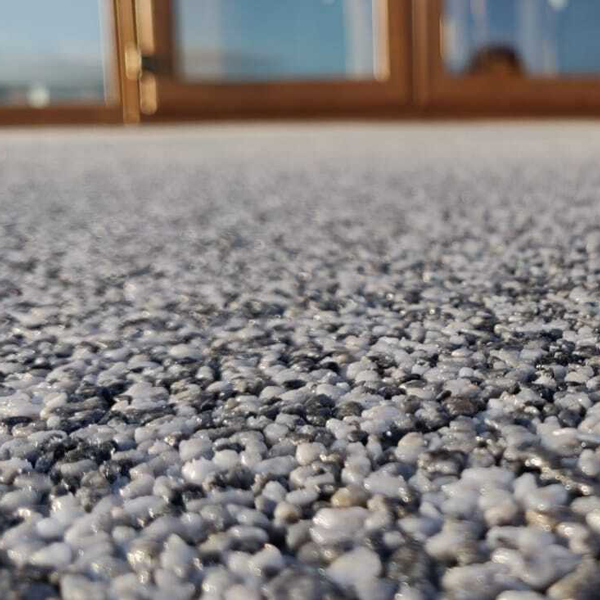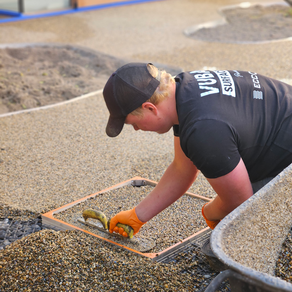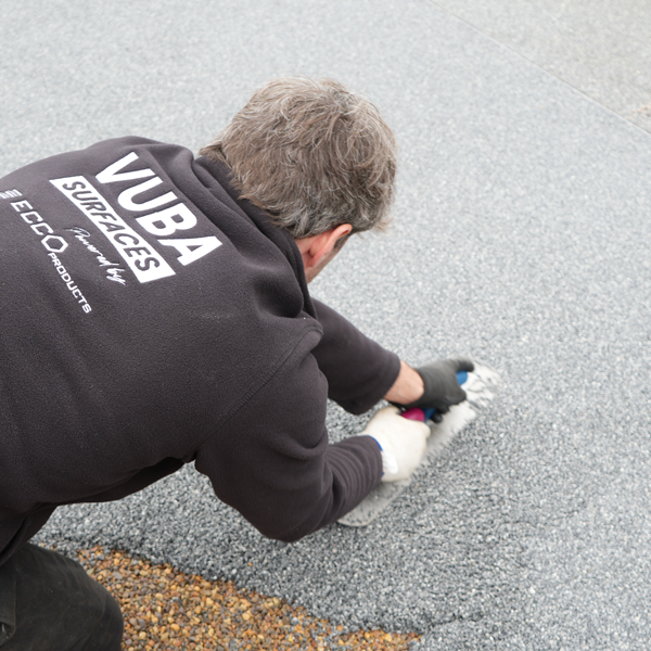 Vuba powered by ECCO est un revêtement en résine perméable, composé de gravier authentique lié avec une résine polyuréthane. Ce revêtement est conçu en plusieurs couches, créant ainsi une structure solide, flexible et perméable à l’eau. Le gravier est disponible en 54 couleurs, offrant une grande liberté de personnalisation.