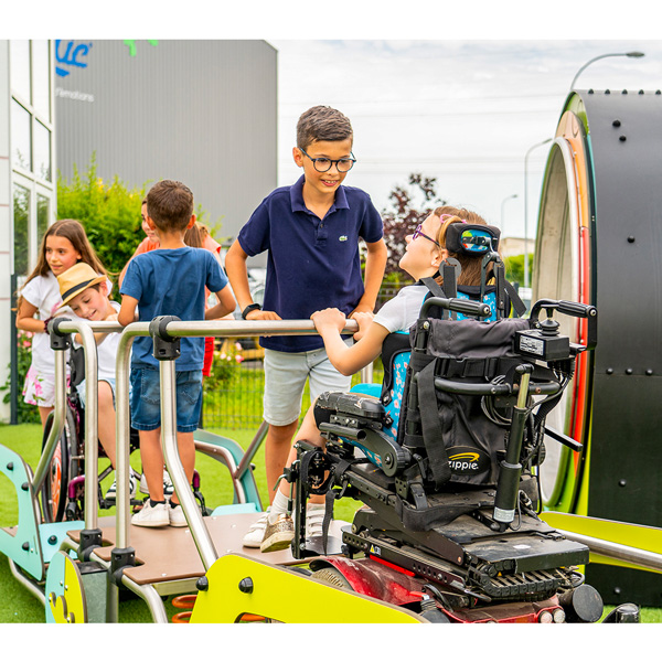 Véritable innovation dans le domaine de l'inclusion, la Bascule inclusive permet aux enfants de partager la joie du balancement. Ce jeu sur ressort peut accueillir jusqu'à 6 joueurs dont 2 joueurs en fauteuils roulants, placés en face à face aux extrémités de la structure. Sa grande capacité d’accueil en fait un point de rencontre et de partage. Ensemble, les enfants décident du rythme à donner au balancement des ressorts répartis sous le plancher, ils créent et maîtrisent le mouvement et font ainsi l’expérience de la coopération.